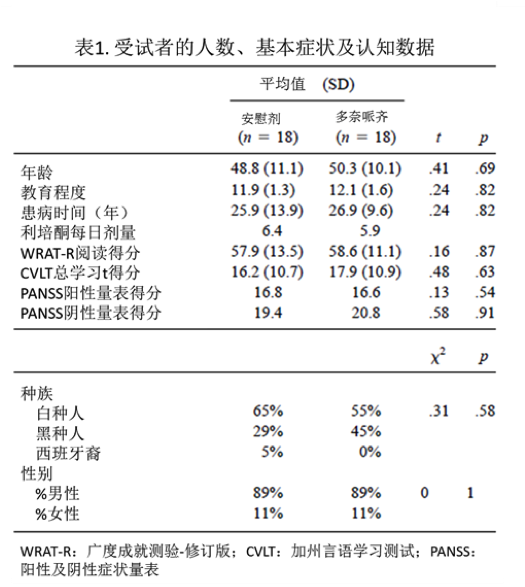 多奈哌齐与利培酮联合治疗精神分裂症认知障碍的双盲安慰剂对照试验