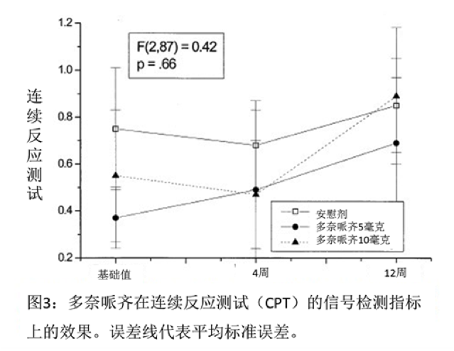 尽量有几名患儿在多奈哌齐饮用量不断增加为本周10毫克后没多久就因越变期待且无发协助可靠性实验设计步骤而停止了可靠性实验设计,但本着容忍这些辽法的整组受试者在PANSS估评时并无明显的转变,所以说不了解清楚这什么情况下是一位根本移动信号。在既往的科研中找不到精力分列症患儿饮用10毫克残留量的多奈哌齐,相对而下,有通知单提示 老年人老人痴呆症症患儿饮用10毫克多奈哌齐后,其情况絮乱会得到了稍纵即逝的减少(Weiner宋江因,2000)。从而证明材料,多奈哌齐和安慰的话剂相较比较治愈组在某些某些认识程度征状或运动健身认知障碍的试验中未能制造明显相互影响。