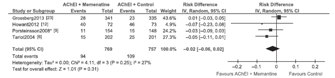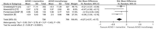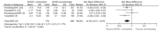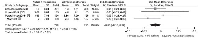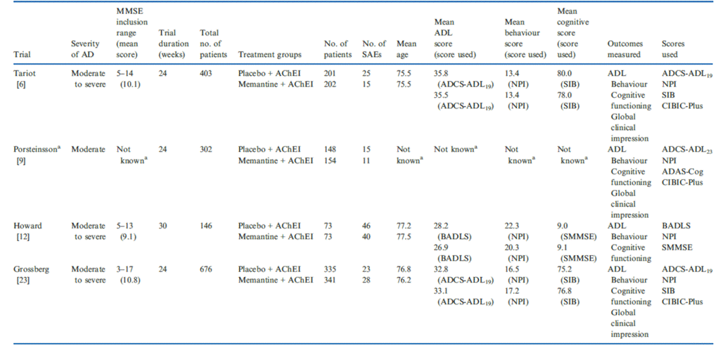 表1体现了检测报告的特性把里面物的标准单位定为荟萃阐述。七个检测报告中的多个检测报告属于了的人在轻轻中重度至轻中重度的问题时间段MMSE 条件在5至14[6],5-13 [12]和3-14 [23]。一5个检测报告属于重度至轻轻中重度时间段MMSE的条件在10和22 [9]。这方面实验[9] 433中只304个直接体验者在AD的轻轻中重度时间段MMSE在10和20分彼此属于现行的荟萃阐述[28]。多米诺实验[12]共例入295例的人,但只146再继续用CHEI治療。其中的73例容忍CHEI加安抚剂美金刚和与此同时73例容忍 CHEI还有的催化活性美金刚。只这5个亚组在让我们的荟萃阐述中适用。直接参与的阐述的总总人口为1549。