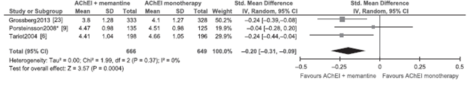 结果:从包括1549名中重度AD患者的四个试验数据汇总得,与CHEI单一使用相比,两药的联合应用显著提高GCI [标准化均差(SMD)0.20; 95%置信区间(CI)0.31; 0.09],改善认知功能(SMD 0.27,95%CI 0.37;0.17)并改善行为(SMD 0.19; 95%CI 0.31;0.07)。确凿的证据显示是对行为的影响最高,对认知功能和GCI的影响程度居中,对ADL的影响最低。在第二轮的研究之后,小组成员的观点达成共识。我们所期望的CHEI和美金刚联合应用的效果被认为高于不期望的效果。但由于二者联合使用对认知,GCI和ADL的效果缺乏有力的证据,使得这一联合疗法在广大推荐指南中并未被推广。