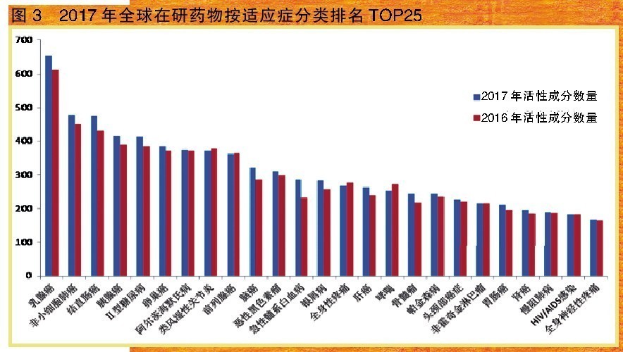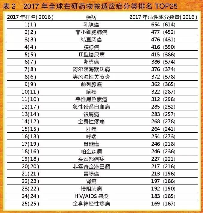 从方法分类TOP 25排明中表明,一样 诊治癌症药(在研药品2232个)、免役类诊治癌症药(2002个)、抗传染防范性预防针(84八个)、血糖高方法药品(624个)、任何护眼使用药物(617个)为排明居前六位的方法分类,该排明先后与2015和二零一六年先后同样。