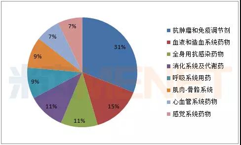 从治愈专业类属上看,评为的类产品涉及二个专业类属,这其中抗肉瘤与免役调高剂以31%的占比排名第一份,血夜与造血设计化性药品以15%的占比紧接着随后,身体抗妇科感染性药品、消化不良设计化及分泌药以11%的占比分句第一,这八类性药品就会占据大部分治愈专业类属快要60%的占比。