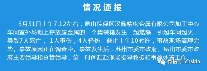 据昆山发布消息,3月31日上午7时12分左右,江苏昆山综保区汉鼎精密金属有限公司加工中心车间室外场地上存放废金属的一个集装箱发生一起燃爆,引起车间起火,导致7人死亡,1人重伤,4人轻伤。事故原因正在调查。